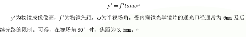 为物镜成像像高,为物镜焦距,为半视场角。受内窥镜光学镜片的通光口径通常为6mm及后续光路的限制。可得,在视场角80°时,焦距为3.5mm。