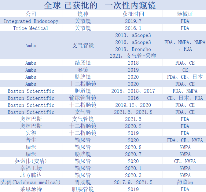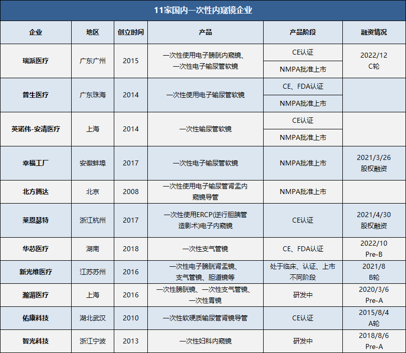 在这片蓝海中已经有部分公司扬帆。据不完全统计,本文梳理了研发生产一次性内窥镜的企业,如下图: